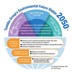 • Response to climate change: To contribute to the Paris Agreement goal, Toshiba set out to achieve carbon neutrality throughout the company’s entire value chain by 2050, with the aim of reducing GHG emissions by 70% by 2030