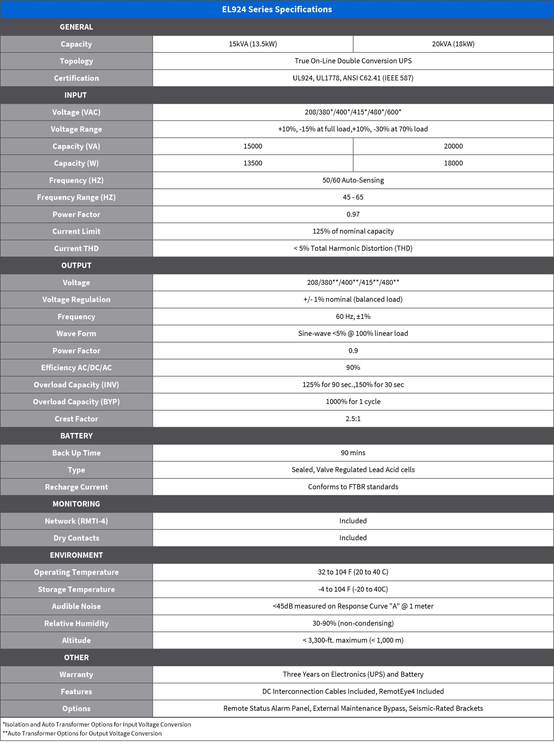 The Toshiba EL924 Series Uninterruptible Power System (UPS) is a compact UL 924 compliant backup solution with 90+ minute runtime using lead acid (VRLA) battery cabinets. This 208V, 4-wire, 3-phrase, 15kVA double-conversion all-IGBT UPS provides a true sinewave ideal for LED lighting technology. As a centralized power hub for large-scale emergency lighting distribution, it reduces installation time and operation costs from having to use and maintain independent UL 924 emergency lighting backup systems from building exits. The EL924 Series ensures efficient, reliable backup power for all UL 924 emergency lighting power applications.