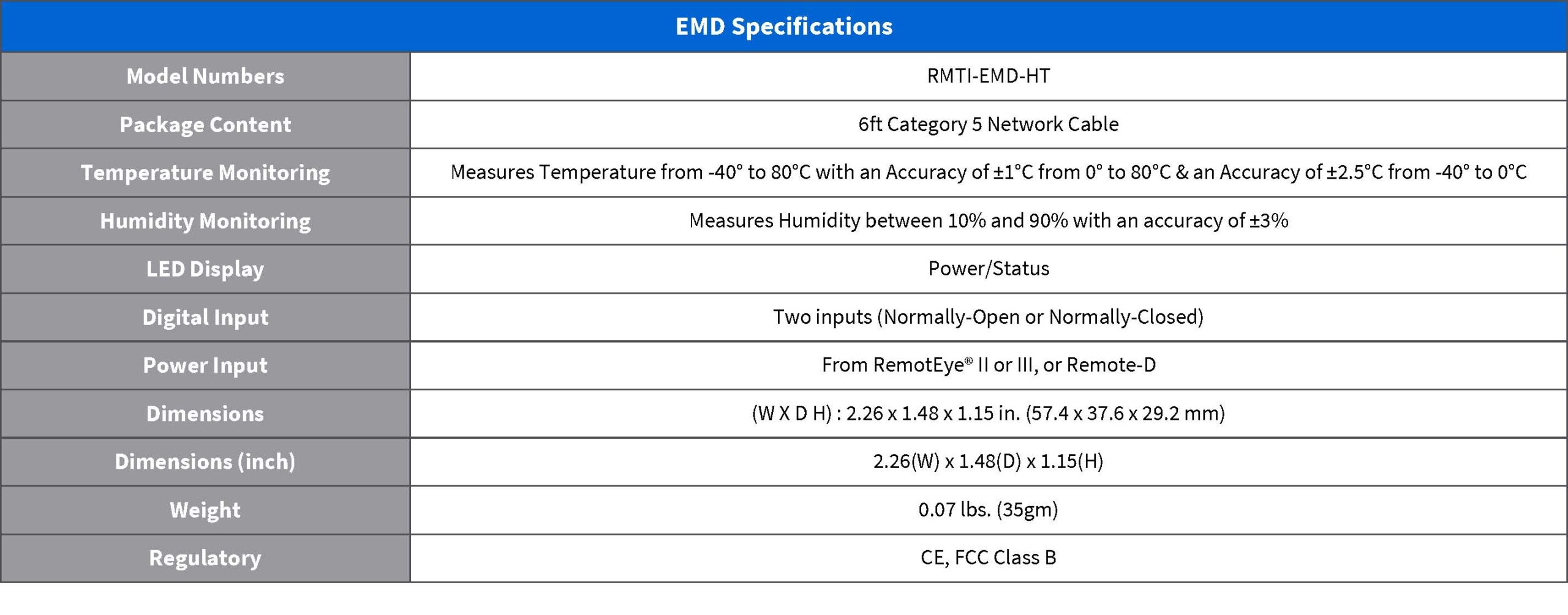 The Environmental Monitoring Device (EMD) enhances RemotEye® by enabling real-time remote monitoring of environmental conditions such as temperature and humidity. Equipped with two user-defined contact inputs, it can be combined with the RemotEye® Sensor Pack to enable the detection of intrusions, vibrations, smoke, and water leaks. This information can be accessed through RemotEye®’s web interface (HTTP), and supports Modbus TCP/RTU, BACnet/IP, and SNMP protocols.