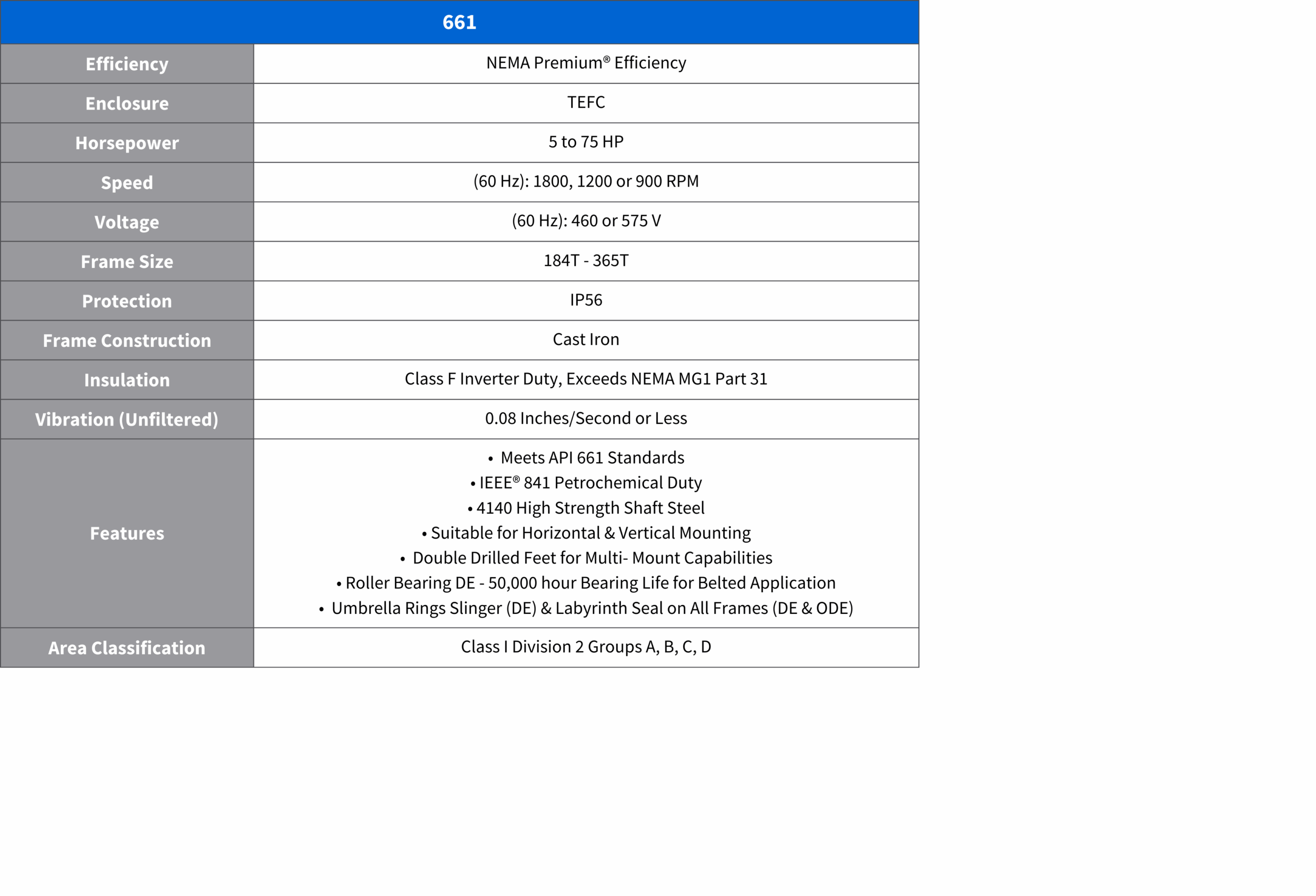 Suitable for horizontal and vertical mounting, the 661 motor features IP56 protection and corrosion-resistant epoxy paint finish, which enhance durability in Class I, Div 2 A-D environments.