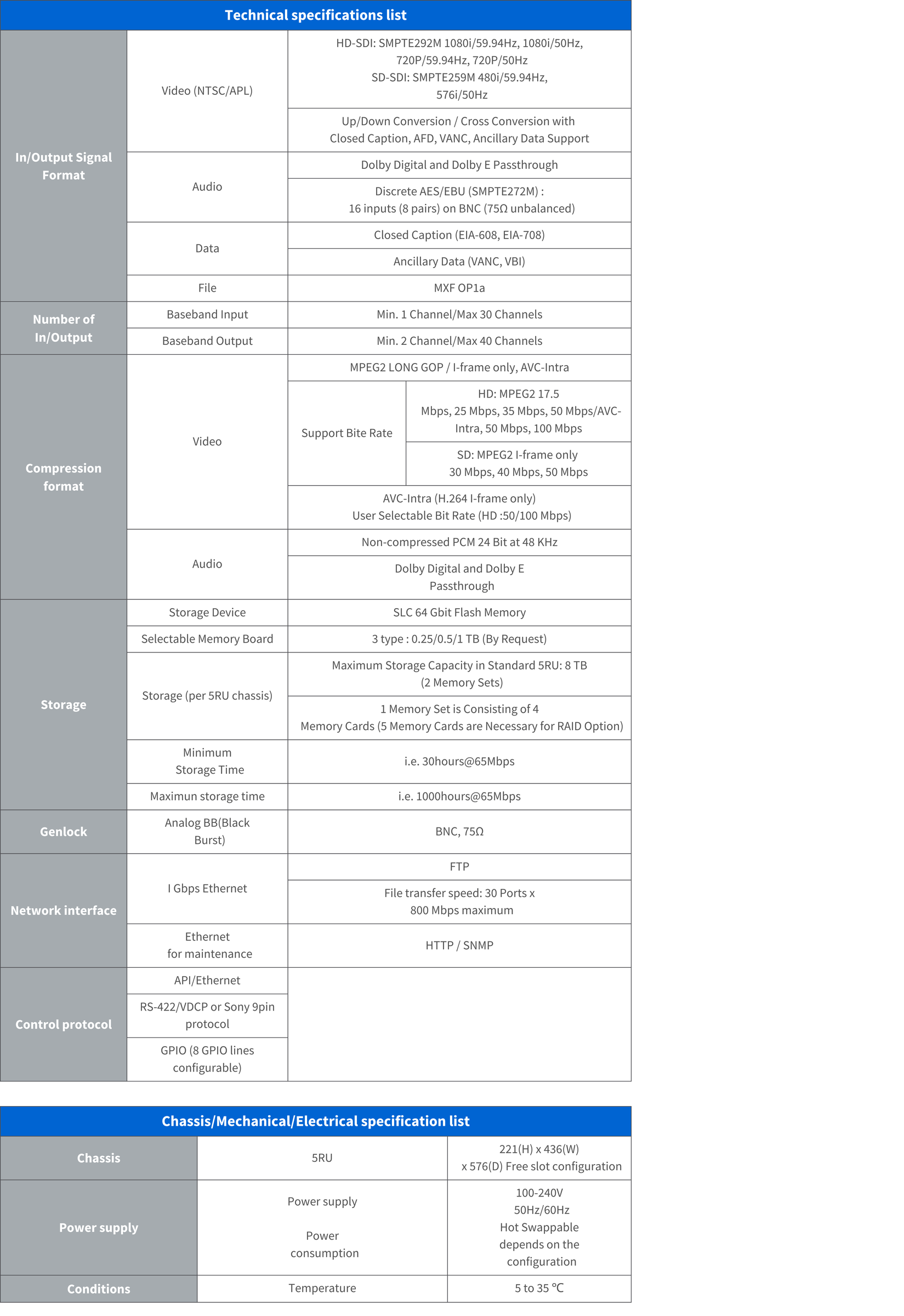 • Offering encoders, decoders, flash memory storage, controllers, and system management, all in a single 5RU chassis. Minimizing chassis size, lowering power consumption, fewer internal cable connections, hot-swappable, and easy maintenance contribute to a greener footprint.