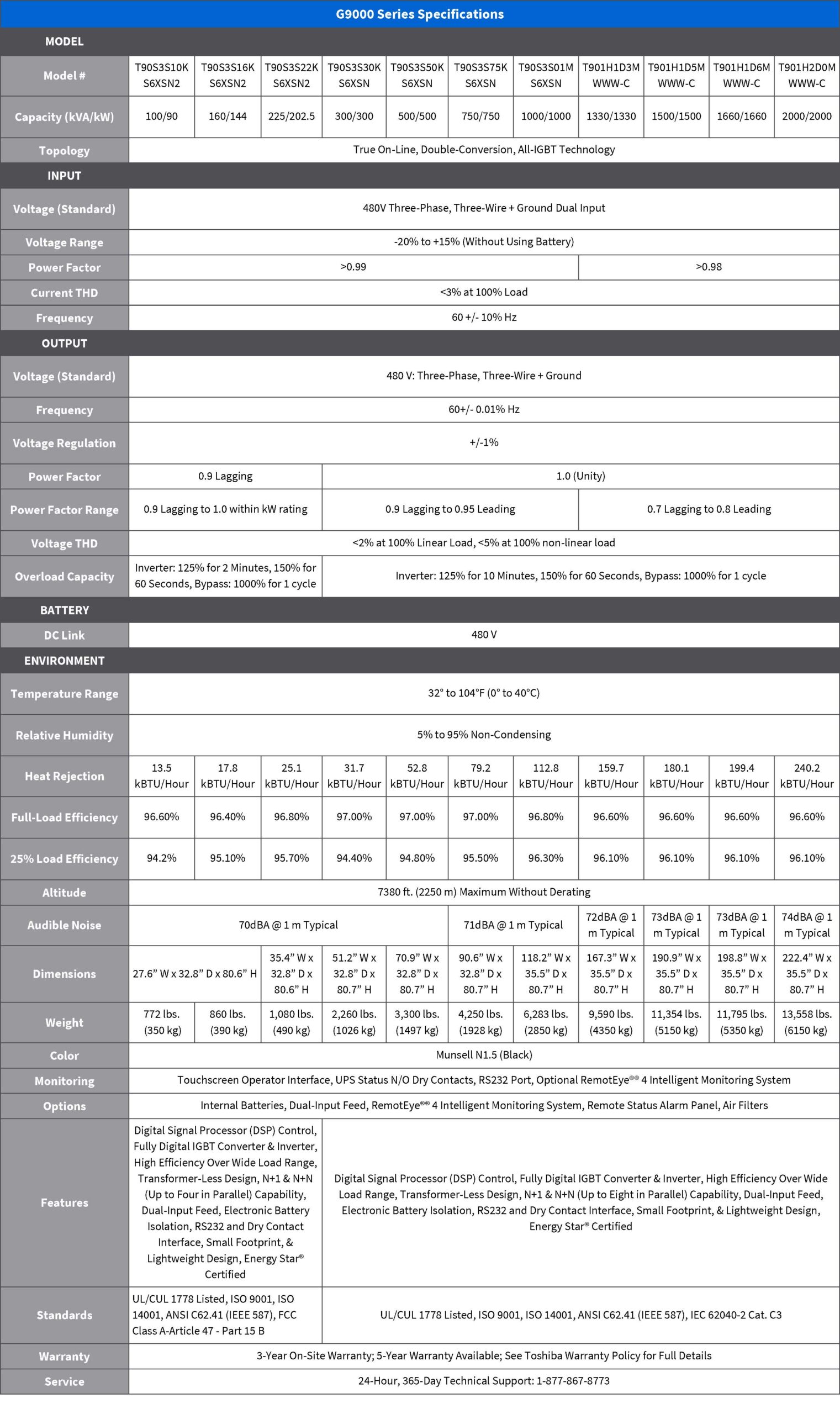 The highly reliable and robust G9000 Series 480V 3 wire + ground monolithic topology UPS comes in model capacities of 100kVA, 160kVA, 225kVA, 300kVA, 500kVA, 750kVA. Featuring Toshiba’s advanced IGBT technology in the rectifier/converter, DC/DC chopper, and inverter circuits, the G9000 achieves up to 97% efficiency at 50-100% loads and over 94% on loads down to 20% ideal for N+1 parallel systems. The G9000 supports stand-alone or parallel configurations of up to 4 units (100-225kVA) or 8 units (300-750kVA) without needing special switchgear cabinets a perfect fit for Small to large scale Data Centers.