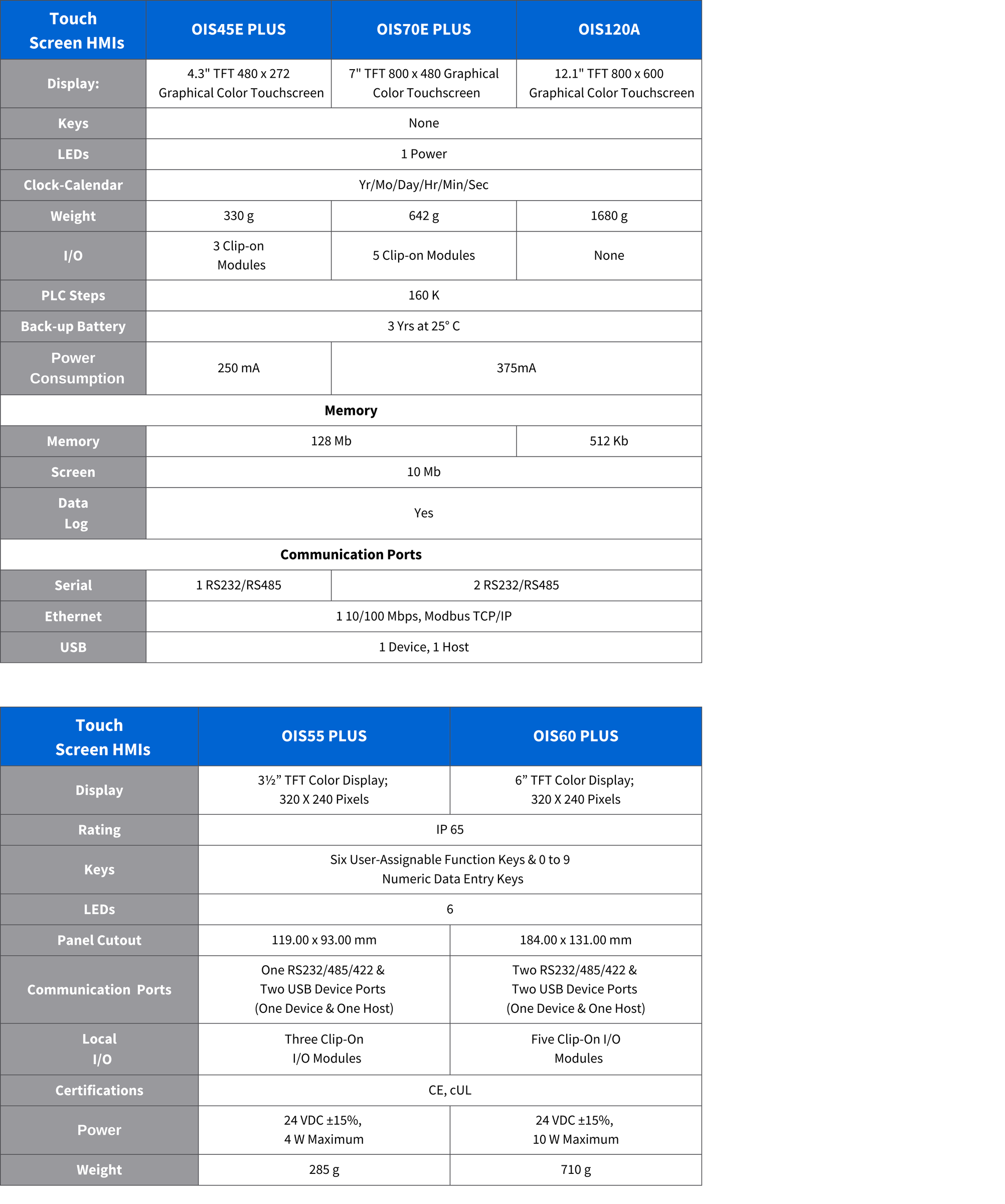 The OIS55 PLUS operator interface station has a 6″ touch-screen color display with six user-defined function keys and six user-defined LEDs. It offers two RS232/422/485 serial ports and two USB ports (one device and one host). The OIS60 PLUS accepts five OIS PLUS clip-on I/O modules in any combination. The tag database is common for the ladder logic and the screen objects.