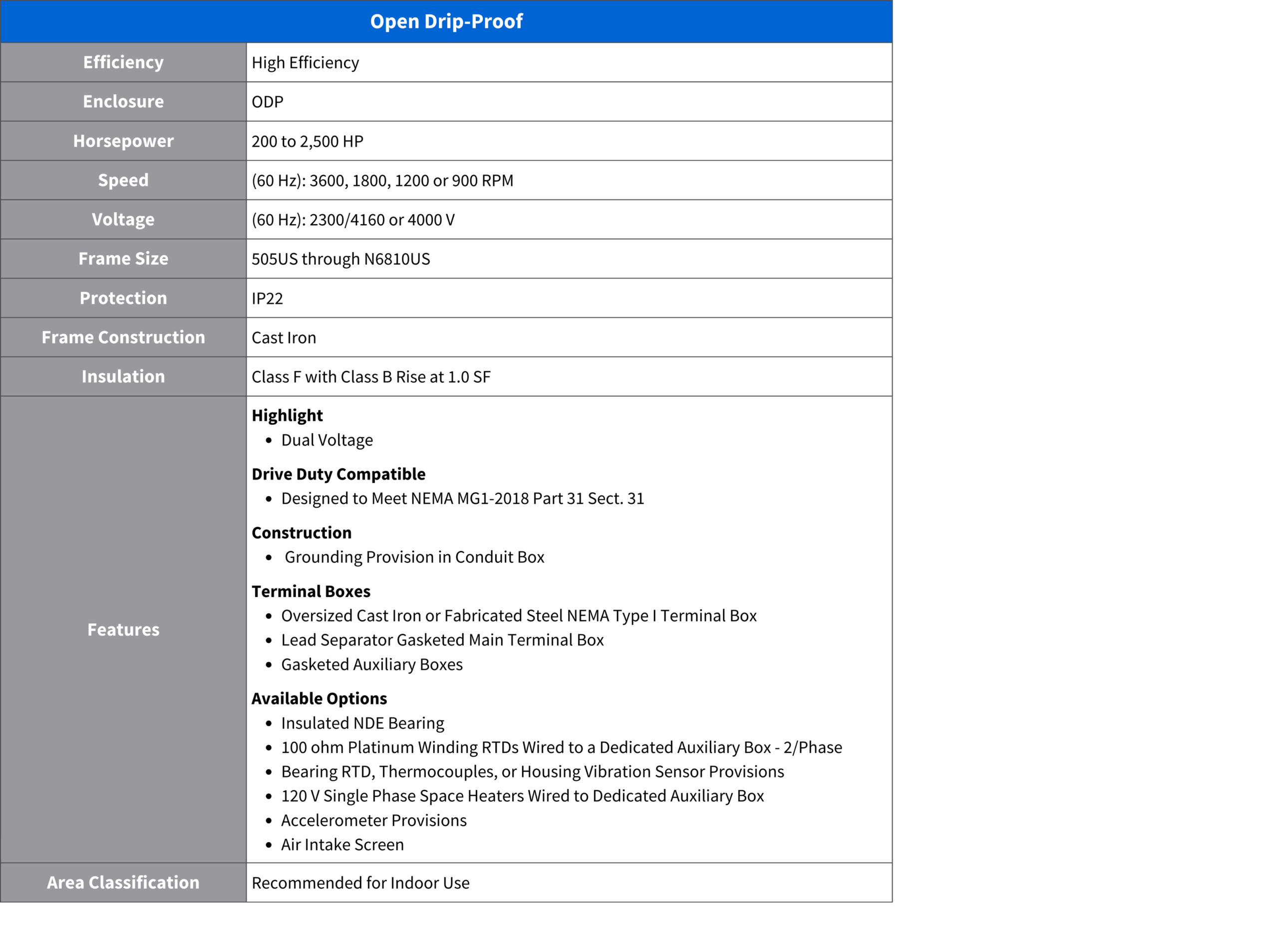 Toshiba’s medium voltage Open Drip-Proof (ODP) motors are designed for optimal performance in clean, dry, and controlled environments. Their open construction allows for effective cooling while preventing liquid droplets from entering the motor, protecting internal components. Known for their high efficiency, ODP motors reduce operating costs and deliver substantial power output, making them optimal for heavy-duty applications. Constructed from robust cast iron, these motors are built to withstand industrial stresses and provide long-term durability. Customizable features allow these motors to meet specific application requirements, including different mounting and cooling options.