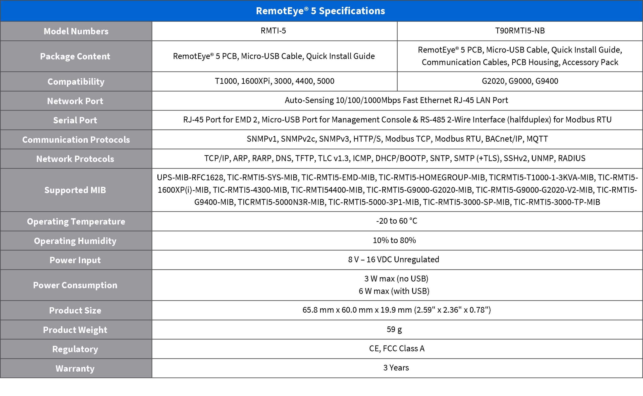 RemotEye® 5 can connect to different network environments using Ethernet, RS-485, or both simultaneously. This flexibility makes the RemotEye® 5 a vital tool for industries that need a dependable UPS management and monitoring solution. With its sophisticated features and intuitive interface, the RemotEye® 5 network card boosts operational efficiency and offers reassurance by continuously monitoring the UPS.