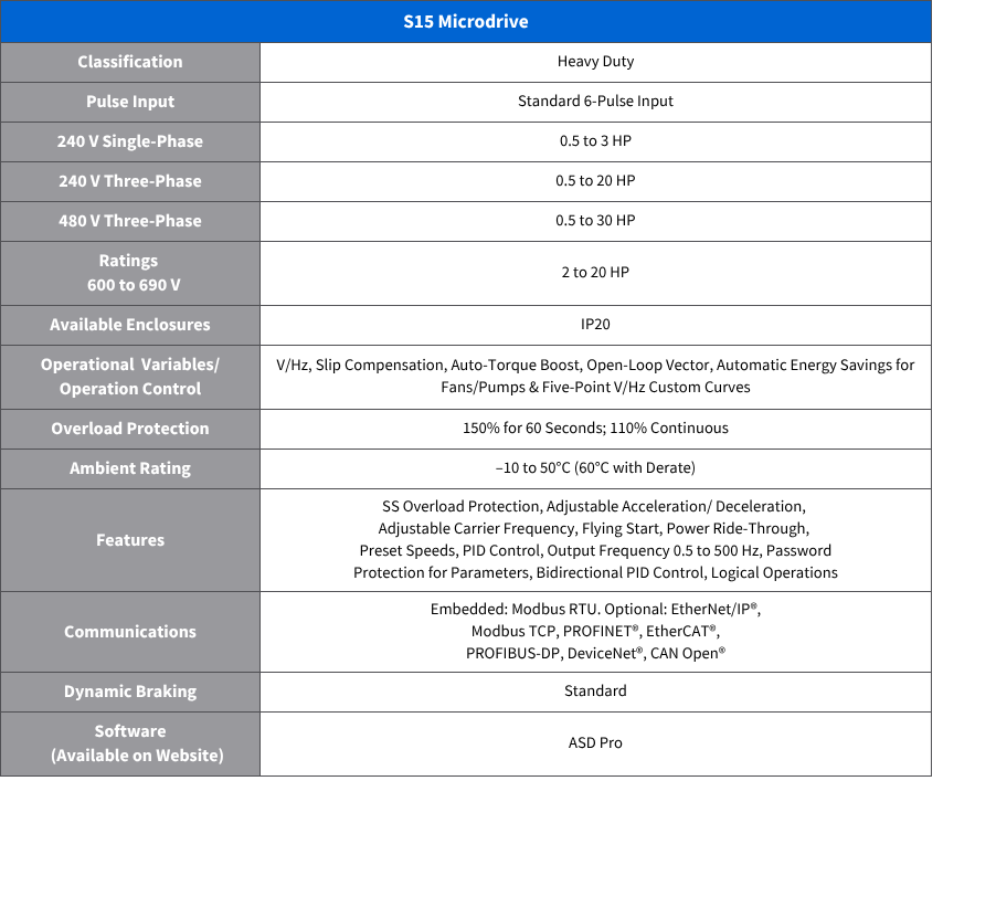 Sets the S15 apart from the competition with one of the most robust micro-drive overload ratings of 110% full-load amp rating for continuous operation and 150% for up to one minute.