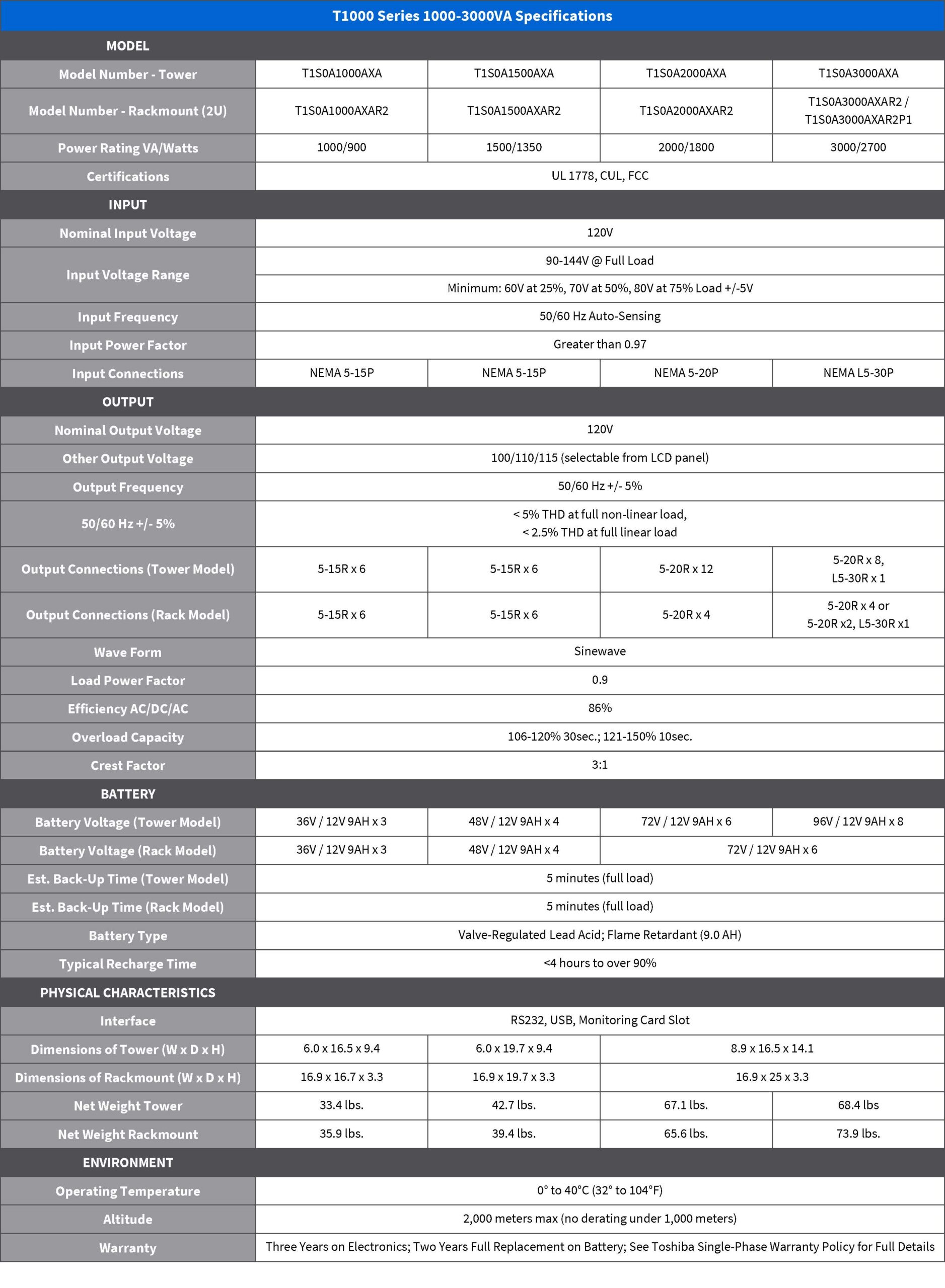 The Toshiba T1000 Series is a highly reliable 120V single-phase double conversion VFI UPS, available in four models: 1000VA, 1500VA, 2000VA, and 3000VA. Utilizing advanced IGBT technology, it corrects power abnormalities to deliver clean, uninterrupted power to critical loads. The T1000 Series features a UPS monitoring program allowing battery capacity tracking, event logging, and email notifications of events as well as load shed control via USB or serial connections. The T1000 is ideal for commercial IT servers, telecommunications, retail, healthcare, broadcasting, and industrial applications.