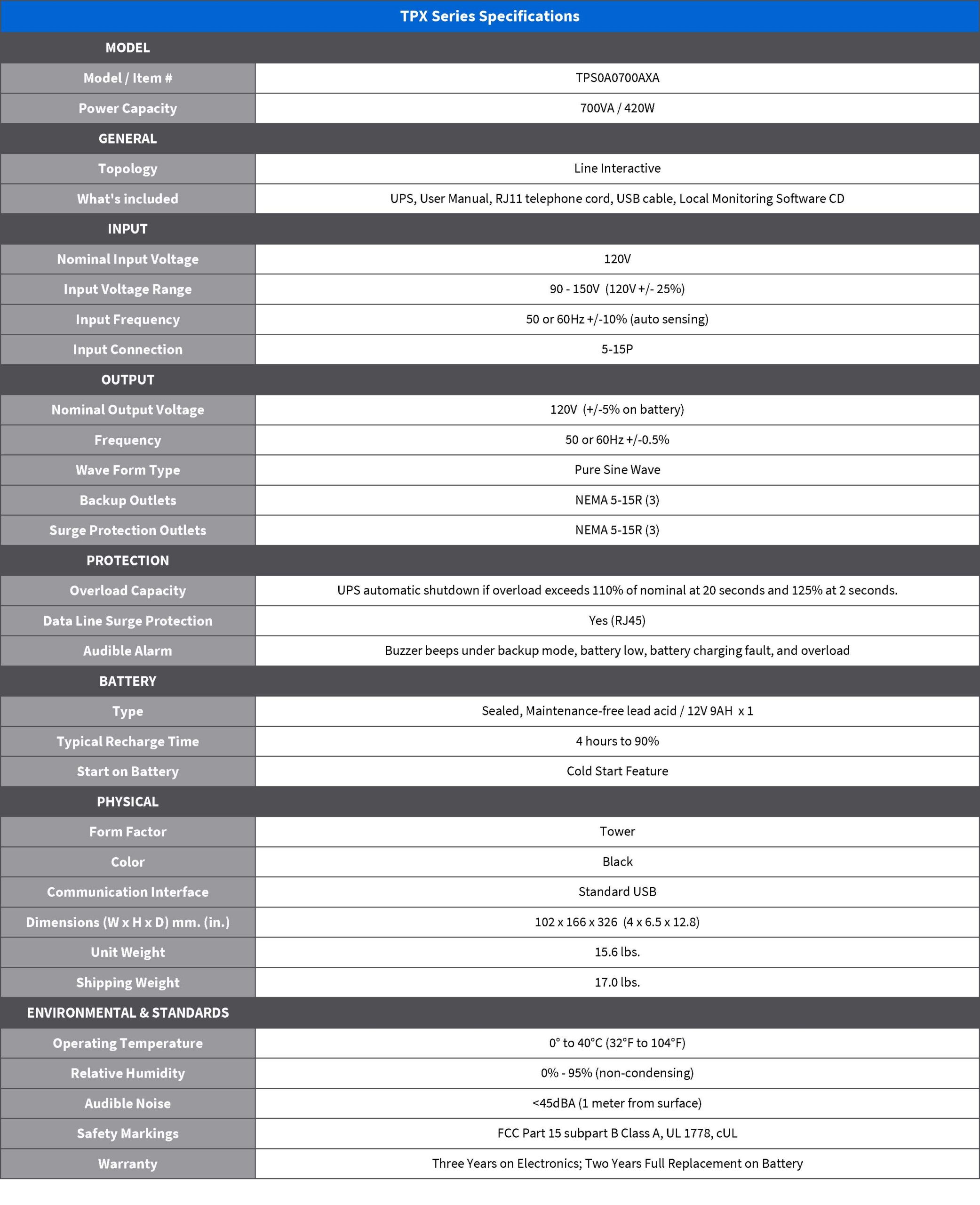 The Toshiba TPX Series Uninterruptible Power System is a compact, economical, and reliable line-interactive sine wave UPS designed for small office computers and electronic equipment. It features automatic voltage regulation (AVR) to adjust high and low voltages instantly, ensuring continuous operation during brownouts and over voltages. The TPX Series provides pure sine wave output, a short battery backup for brief outages, an LED display, automatic self-diagnostics, alarm warnings, cold start capability, and comprehensive protections against surges, short circuits, overloads, and data line issues.