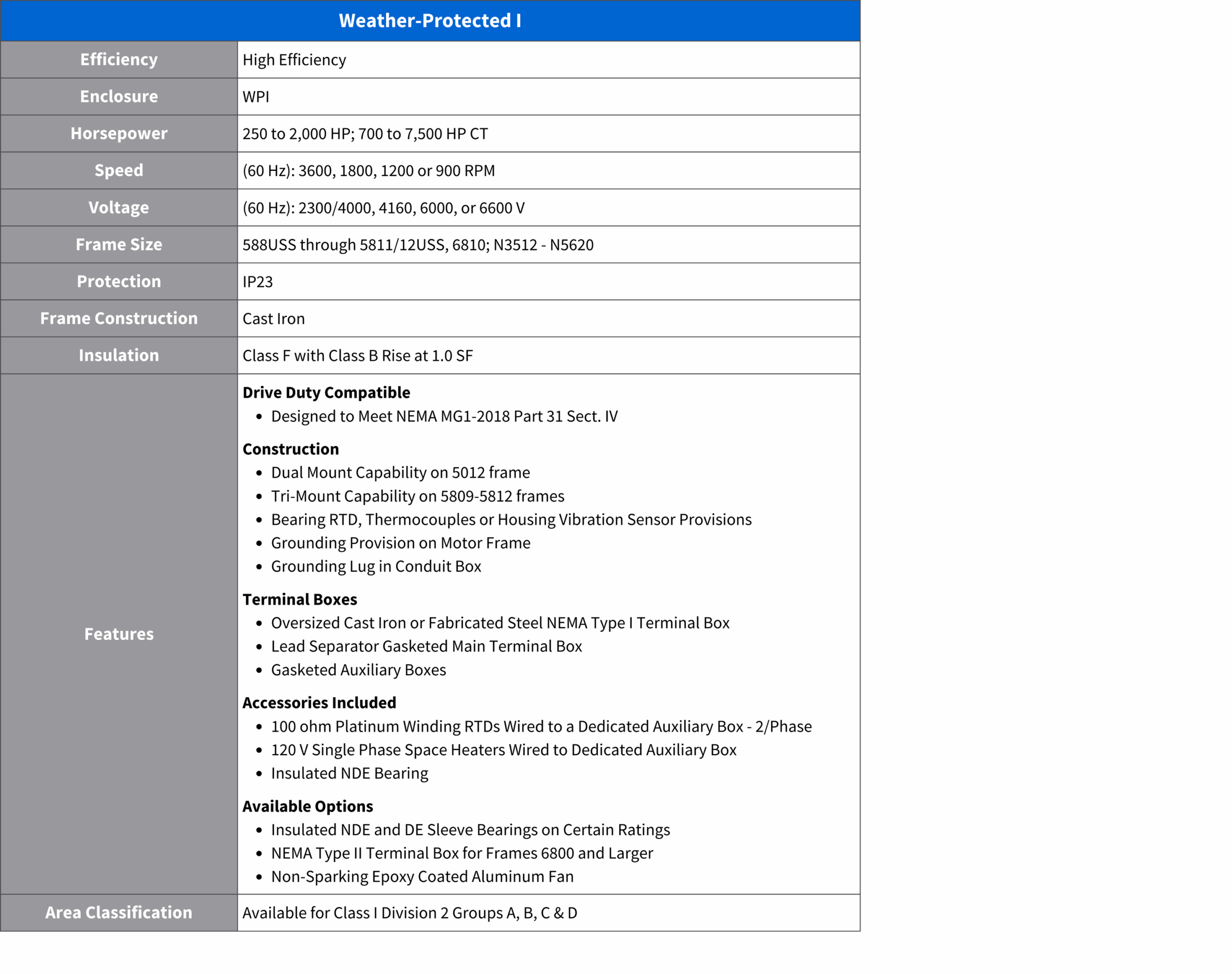 Toshiba’s General Purpose Weather-Protected Type I (WPI) motor series includes ventilation openings with overhanging covers for efficient cooling and protection against environmental hazards. Built with robust materials and corrosion-resistant coatings, these motors offer durability and ease of maintenance. They are designed to meet the industry’s needs for energy conservation and reliability in indoor environments. These customizable motors are ideal for various applications, including power generation, water and wastewater treatment, oil and gas, and more.